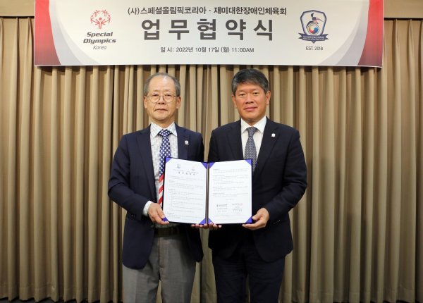 17일 진행된 업무협약식에서 기념촬영을 하고 있는 재미대한장애인체육회 송재성 수석부회장(왼쪽)과 스페셜올림픽코리아 이용훈 회장. 사진제공 | 스페셜올림픽코리아