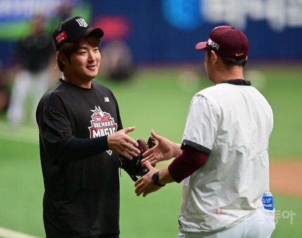 17일 서울 고척스카이돔에서 열린 ‘2022 신한은행 SOL KBO리그’ 준 플레이오프 1차전 키움 히어로즈와 KT 위즈의 경기에 앞서 KT 박병호가 키움 코치와 인사하고 있다.