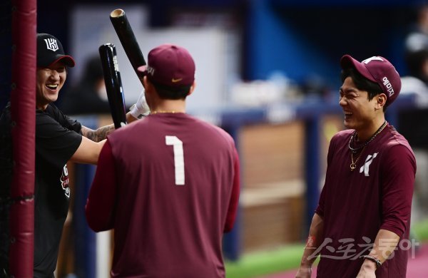 17일 서울 고척스카이돔에서 열린 ‘2022 신한은행 SOL KBO리그’ 준 플레이오프 1차전 키움 히어로즈와 KT 위즈의 경기에 앞서 KT 김민혁과 키움 김태진이 이야기를 하고 있다.