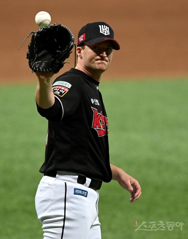 17일 서울 고척스카이돔에서 ‘2022 신한은행 SOL KBO리그’ 키움 히어로즈와 kt 위즈의 준PO 2차전 경기가 열렸다. 4회말 1사에서 kt 선발 벤자민이 이정후에게 안타를 허용 후 아쉬워하고 있다.