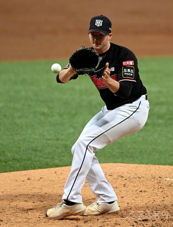 17일 서울 고척스카이돔에서 ‘2022 신한은행 SOL KBO리그’ 키움 히어로즈와 kt 위즈의 준PO 2차전 경기가 열렸다. 3회말 2사에서 kt 벤자민이 투수 앞 땅볼 타구를 수비하고 있다.