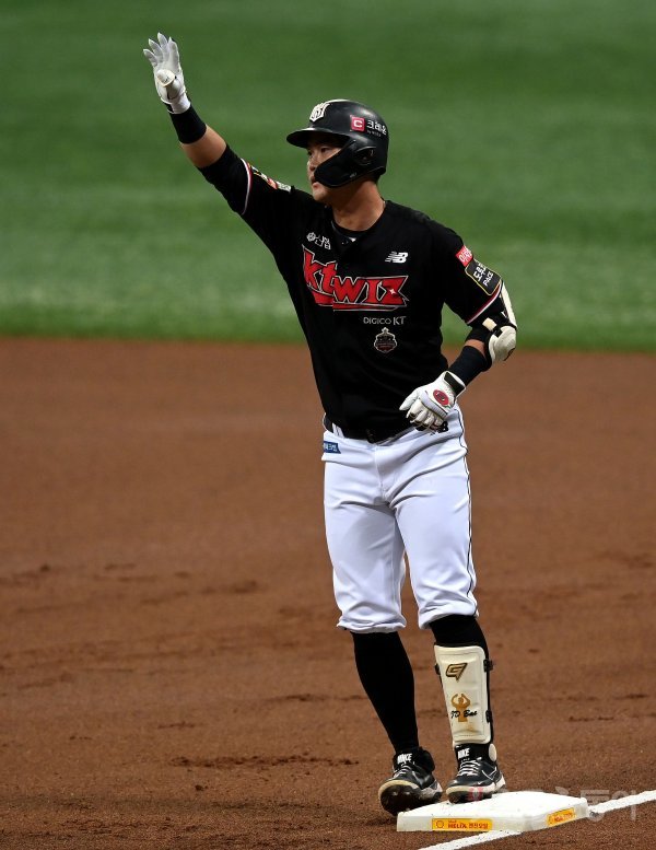 17일 서울 고척스카이돔에서 ‘2022 신한은행 SOL KBO리그’ 키움 히어로즈와 kt 위즈의 준PO 2차전 경기가 열렸다. 1회초 무사에서 kt 배정대가 안타를 날린 후 환호하고 있다.