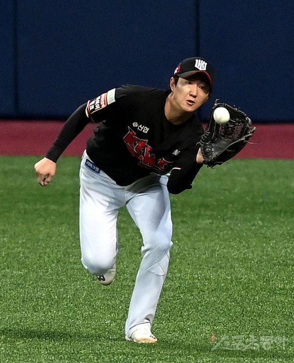 17일 서울 고척스카이돔에서 ‘2022 신한은행 SOL KBO리그’ 키움 히어로즈와 kt 위즈의 준PO 2차전 경기가 열렸다. 3회말 1사에서 kt 김민혁이 수비를 펼치고 있다.