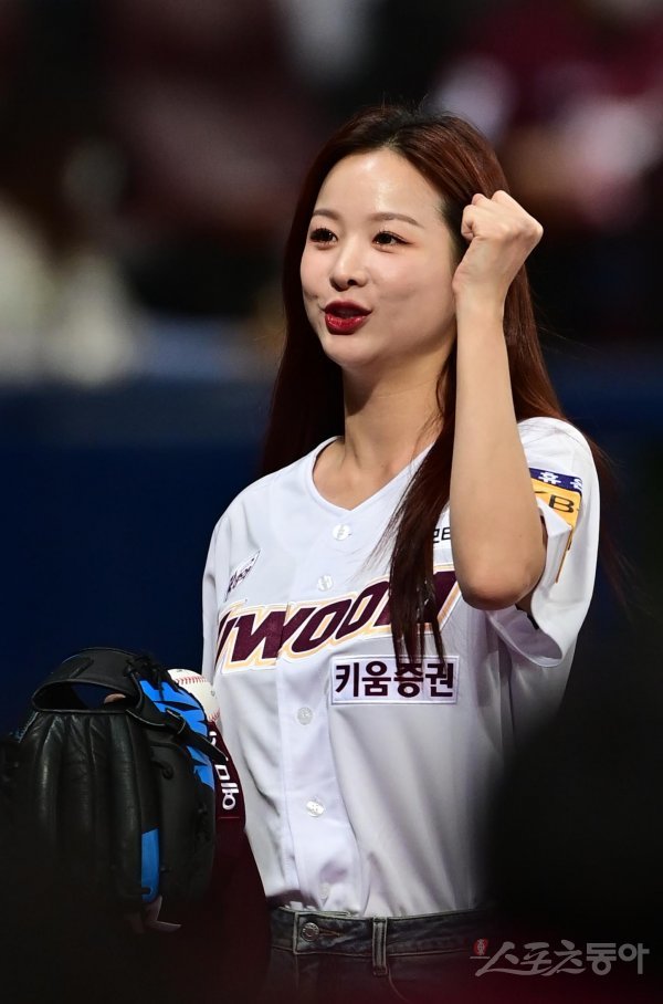 17일 서울 고척스카이돔에서 열린 ‘2022 신한은행 SOL KBO리그’ 준 플레이오프 1차전 키움 히어로즈와 KT 위즈의 경기에 앞서 가수 솔지가 승리 기원 시구를 마친 후 파이팅을 외치고 있다.