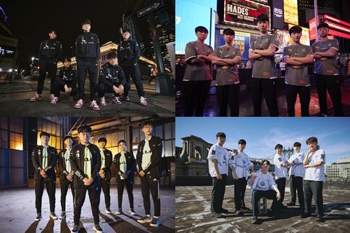 ‘2022 리그오브레전드 월드 챔피언십’에서 8강에 안착한 한국 리그(LCK)의 T1, 젠지, DRX, 담원 기아 선수들(왼쪽 위부터 시계방향). 지난해 중국(LPL) 에드워드 게이밍에게 내줬던 우승 트로피를 올해 LCK가 찾아올 수 있을지 관심이 모아지고 있다. 사진제공 | 라이엇게임즈