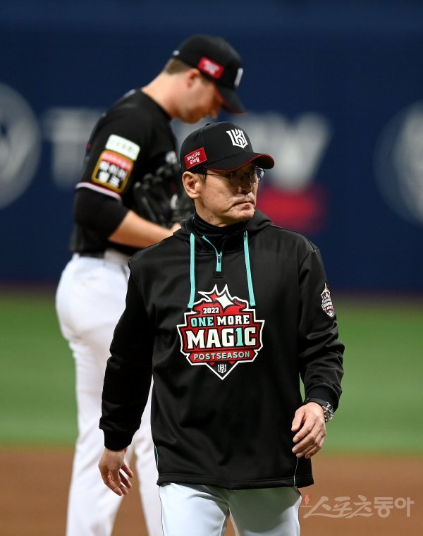 17일 서울 고척스카이돔에서 ‘2022 신한은행 SOL KBO리그’ 키움 히어로즈와 kt 위즈의 준PO 2차전 경기가 열렸다. 7회말 2사 1루에서 kt 이강철 감독이 마운드에 올라 벤자민과 이야기를 나눈 후 더그아웃으로 향하고 있다.