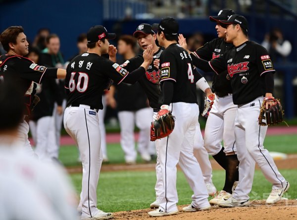17일 서울 고척스카이돔에서 열린 ‘2022 신한은행 SOL KBO리그’ 준 플레이오프 1차전 키움 히어로즈와 KT 위즈의 경기에서 2-0으로 승리한 KT 선수들이 기쁨을 나누고 있다.