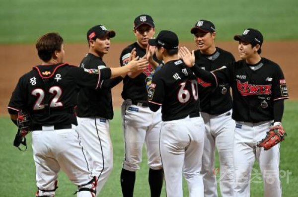 17일 서울 고척스카이돔에서 ‘2022 신한은행 SOL KBO리그’ 키움 히어로즈와 kt 위즈의 준PO 2차전 경기가 열렸다. kt가 키움을 상대로 2-0으로 승리한 후 선수들이 그라운드에서 기쁨을 나누고 있다.