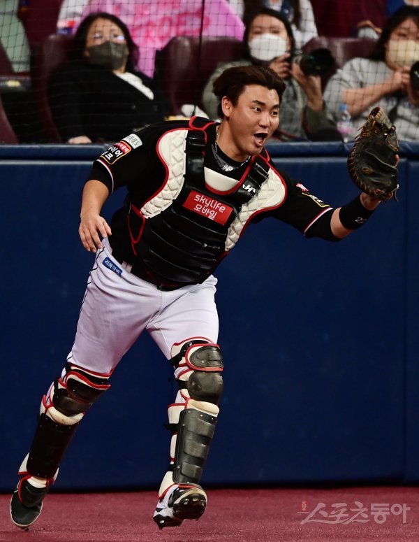 17일 서울 고척스카이돔에서 열린 ‘2022 신한은행 SOL KBO리그’ 준 플레이오프 1차전 키움 히어로즈와 KT 위즈의 경기에서 9회말 2사 키움의 뜬공을 잡은 KT 장성우가 기뻐하고 있다.