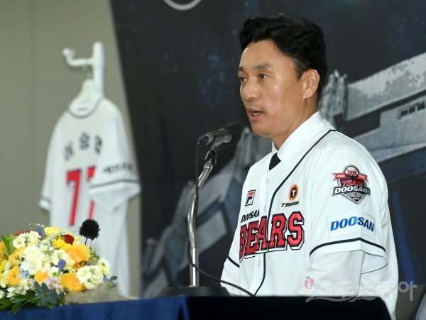 두산 베어스 제11대 사령탑 이승엽 감독이 18일 서울 잠실야구장에서 진행된 취임식에서 유니폼을 입고 취재진의 질문에 대답하고 있다.