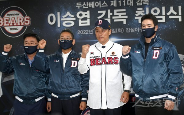 두산 베어스 제11대 사령탑 이승엽 감독이 18일 서울 잠실야구장에서 진행된 취임식에서 유니폼을 입고 김태룡 단장, 전풍 사장, 김재환과 기념촬영을 하고 있다.