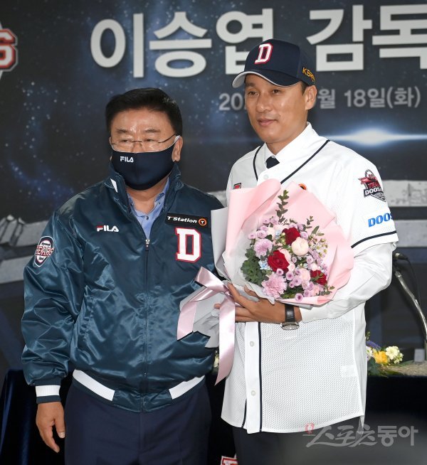 두산 베어스 제11대 사령탑 이승엽 감독이 18일 서울 잠실야구장에서 진행된 취임식에서 유니폼을 입고 김태룡 단장과 기념촬영을 하고 있다.