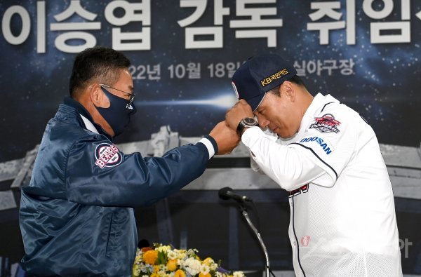 두산 베어스 제11대 사령탑 이승엽 감독이 18일 서울 잠실야구장에서 진행된 취임식에서 전풍 사장에게 모자를 전달받고 있다.