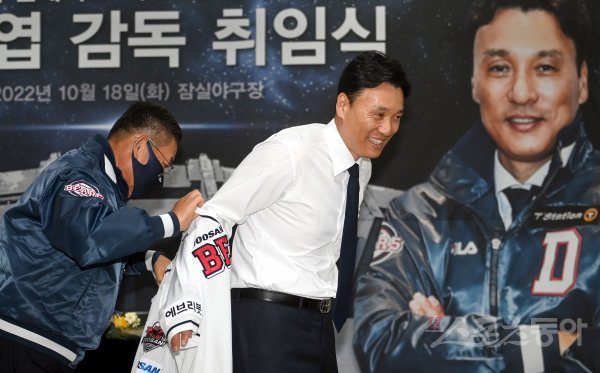 두산 베어스 제11대 사령탑 이승엽 감독이 18일 서울 잠실야구장에서 진행된 취임식에서 유니폼을 입고 있다.