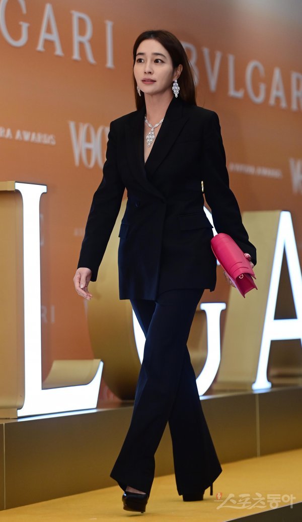 배우 이민정이 18일 서울 광진구 광장동 그랜드워커힐서울에서 열린 한 럭셔리 주얼리 브랜드의 시상식 포토월에 오르고 있다.