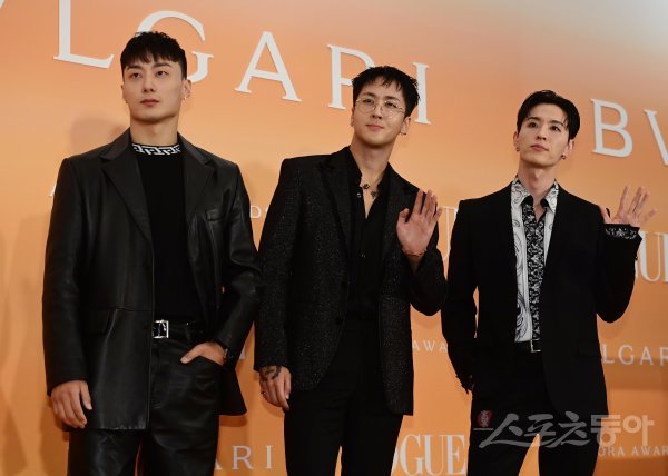 가수 넉스, 라비, 트릭스가 18일 서울 광진구 광장동 그랜드워커힐서울에서 열린 한 럭셔리 주얼리 브랜드의 시상식 포토월에서 포즈를 취하고 있다.