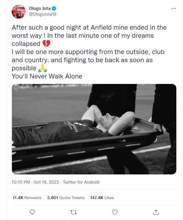 조타는 인스타그램에 "안필드의 멋진 밤이 최악으로 끝났다. 마지막 1분에 내 꿈(월드컵 출전)이 붕괴됐다. 경기장 밖에서 리버풀과 포르투갈 대표팀을 응원하겠다. 열심히 부상과 싸워 최대한 빨리 복귀하겠다"고 적었다.