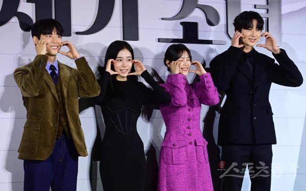배우 박정우, 노윤서, 김유정, 변우석이 19일 서울 용산구 CGV용산아이파크몰점에서 열린 넷플릭스 ‘20세기 소녀’ 제작보고회에서 포즈를 취하고 있다.