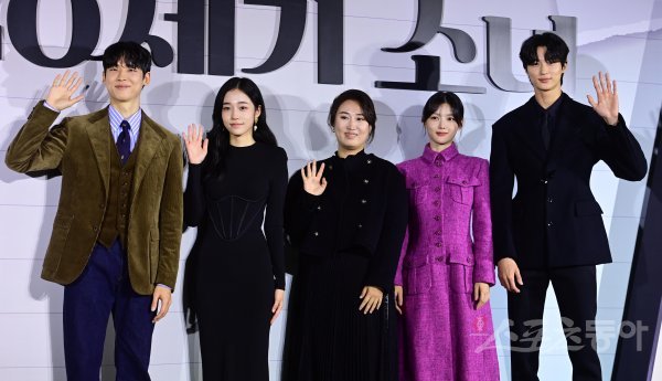 배우 박정우, 노윤서, 방우리 감독, 김유정, 변우석이 19일 서울 용산구 CGV용산아이파크몰점에서 열린 넷플릭스 ‘20세기 소녀’ 제작보고회에서 포즈를 취하고 있다.