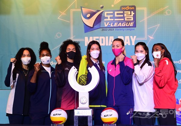 19일 서울 강남구 청담동 호텔리베라청담에서 열린 ‘도드람 2022-2023 V-리그’ 여자부 개막 미디어데이에서 IBK기업은행 산타나, GS칼텍스 모마, KGC인삼공사 엘리자벳, 현대건설 야스민, 흥국생명 옐레나, 한국도로공사 카타리나, 페퍼저축은행 니아 리드가 포즈를 취하고 있다.
