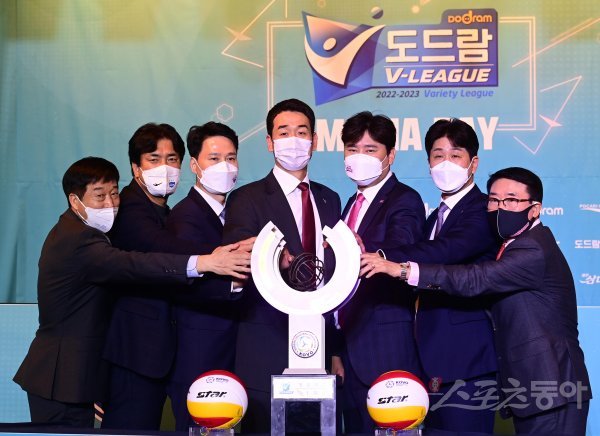 19일 서울 강남구 청담동 호텔리베라청담에서 열린 ‘도드람 2022-2023 V-리그’ 여자부 개막 미디어데이에서 IBK기업은행 김호철 감독, GS칼텍스 차상현 감독, 현대건설 강성형 감독, KGC인삼공사 고희진 감독, 흥국생명 권순찬 감독, 한국도로공사 김종민 감독, 페퍼저축은행 김형실 감독이 포즈를 취하고 있다.