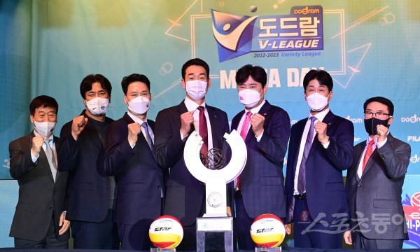 19일 서울 강남구 청담동 호텔리베라청담에서 열린 ‘도드람 2022-2023 V-리그’ 여자부 개막 미디어데이에서 IBK기업은행 김호철 감독, GS칼텍스 차상현 감독, 현대건설 강성형 감독, KGC인삼공사 고희진 감독, 흥국생명 권순찬 감독, 한국도로공사 김종민 감독, 페퍼저축은행 김형실 감독이 포즈를 취하고 있다.