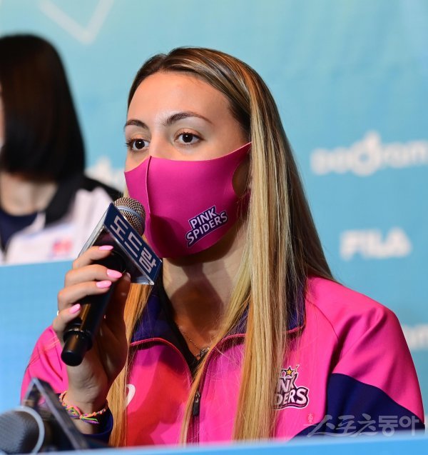 19일 서울 강남구 청담동 호텔리베라청담에서 열린 ‘도드람 2022-2023 V-리그’ 여자부 개막 미디어데이에서 흥국생명 옐레나가 인사말을 하고 있다.