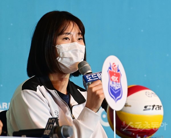 19일 서울 강남구 청담동 호텔리베라청담에서 열린 ‘도드람 2022-2023 V-리그’ 여자부 개막 미디어데이에서 한국도로공사 박정아가 인사말을 하고 있다.