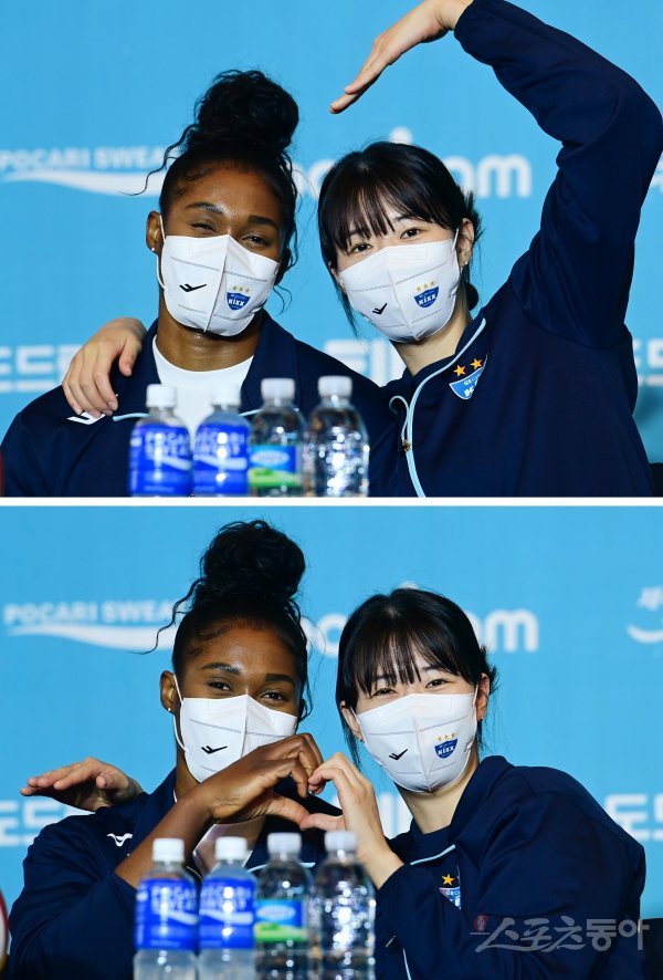 19일 서울 강남구 청담동 호텔리베라청담에서 열린 ‘도드람 2022-2023 V-리그’ 여자부 개막 미디어데이에서 GS칼텍스 강소휘와 모마가 포즈를 취하고 있다.