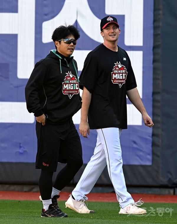 19일 경기도 수원 kt위즈파크에서 ‘2022 신한은행 SOL KBO리그’ kt 위즈와 키움 히어로즈의 준PO 3차전 경기가 열린다. 경기 전 kt 조용호와 벤자민이 가볍게 훈련을 펼치고 있다.