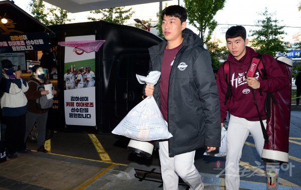 19일 경기도 수원 kt위즈파크에서 ‘2022 신한은행 SOL KBO리그’ kt 위즈와 키움 히어로즈의 준PO 3차전 경기가 열린다. 경기 전 키움 송성문, 김혜성이 MLB 샌디에이고 파드리스 김하성이 응원차 보낸 커피차를 지나고 있다.