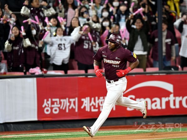 19일 경기도 수원 kt위즈파크에서 ‘2022 신한은행 SOL KBO리그’ kt 위즈와 키움 히어로즈의 준PO 3차전 경기가 열렸다. 1회초 2사 1, 2루에서 키움 푸이그가 3점 홈런을 쏘아 올린 후 그라운드를 돌고 있다.