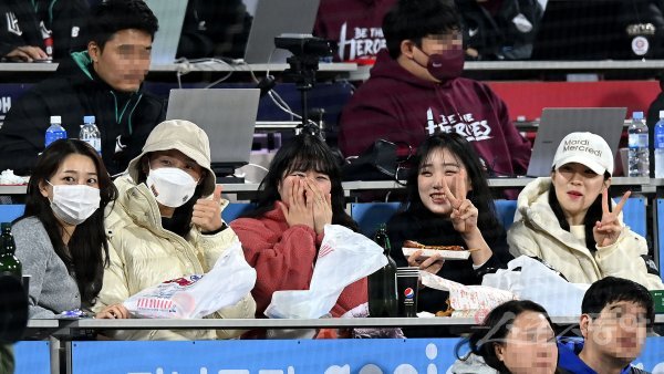 19일 경기도 수원 kt위즈파크에서 ‘2022 신한은행 SOL KBO리그’ kt 위즈와 키움 히어로즈의 준PO 3차전 경기가 열렸다. 흥국생명 김연경(왼쪽 2번째)이 동료들과 함께 야구장을 찾아 카메라를 향해 포즈를 취하고 있다.