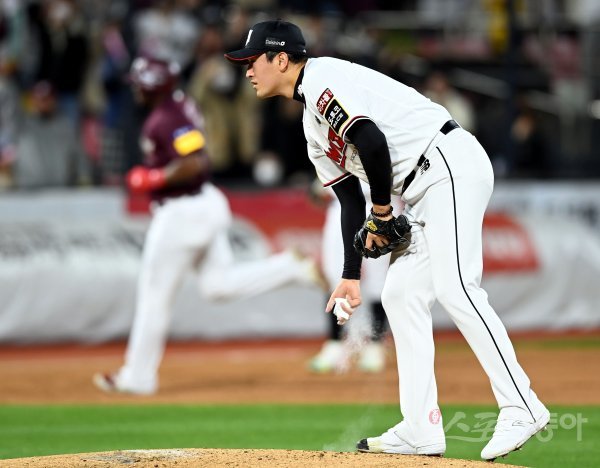 19일 경기도 수원 kt위즈파크에서 ‘2022 신한은행 SOL KBO리그’ kt 위즈와 키움 히어로즈의 준PO 3차전 경기가 열렸다. 1회초 2사 1, 2루에서 홈런을 허용한 kt 고영표가 아쉬워하고 있다.