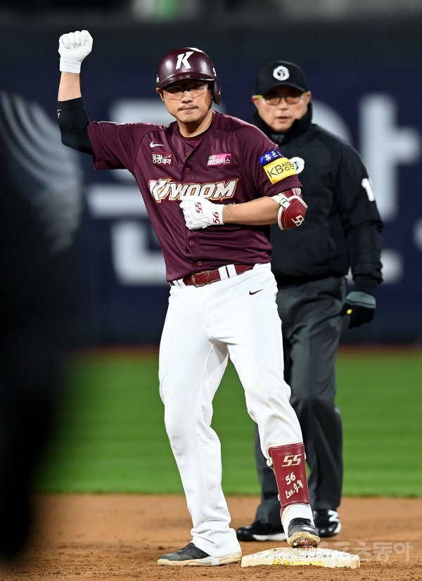 19일 경기도 수원 kt위즈파크에서 ‘2022 신한은행 SOL KBO리그’ kt 위즈와 키움 히어로즈의 준PO 3차전 경기가 열렸다. 4회초 무사에서 키움 이지영이 2루타를 날리고 있다.