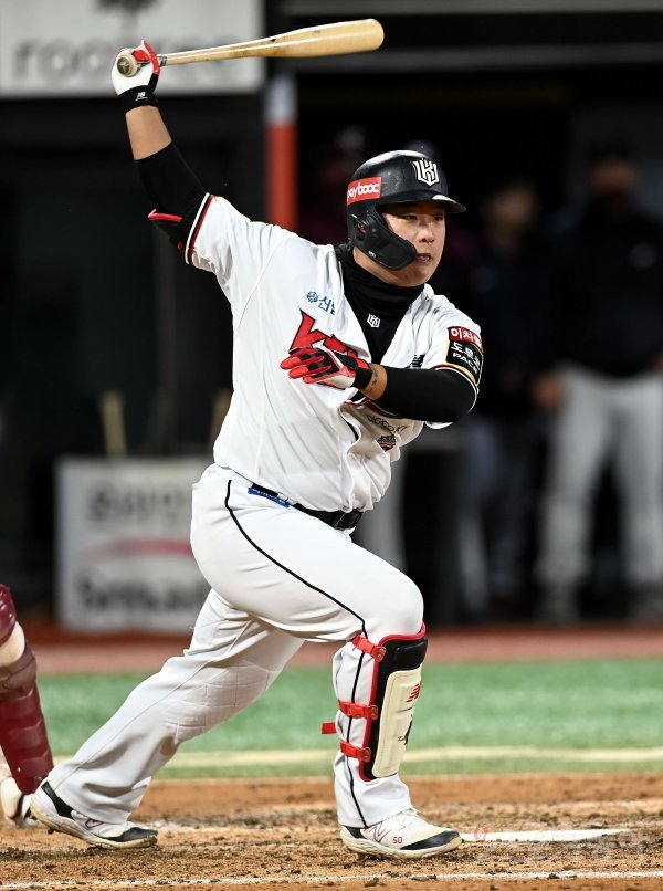 19일 경기도 수원 kt위즈파크에서 ‘2022 신한은행 SOL KBO리그’ kt 위즈와 키움 히어로즈의 준PO 3차전 경기가 열렸다. 3회말 무사 1루에서 kt 강백호가 1타점 2루타를 날리고 있다.