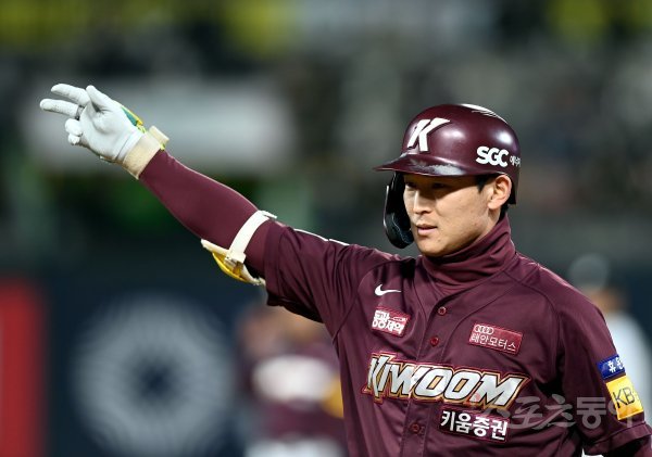19일 경기도 수원 kt위즈파크에서 ‘2022 신한은행 SOL KBO리그’ kt 위즈와 키움 히어로즈의 준PO 3차전 경기가 열렸다. 4회초 무사 만루에서 키움 김준와이 2타점 적시타를 날린 후 환호하고 있다.