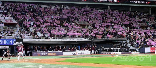19일 경기도 수원 kt위즈파크에서 ‘2022 신한은행 SOL KBO리그’ kt 위즈와 키움 히어로즈의 준PO 3차전 경기가 열렸다. 키움 야구팬들이 응원을 펼치고 있다.