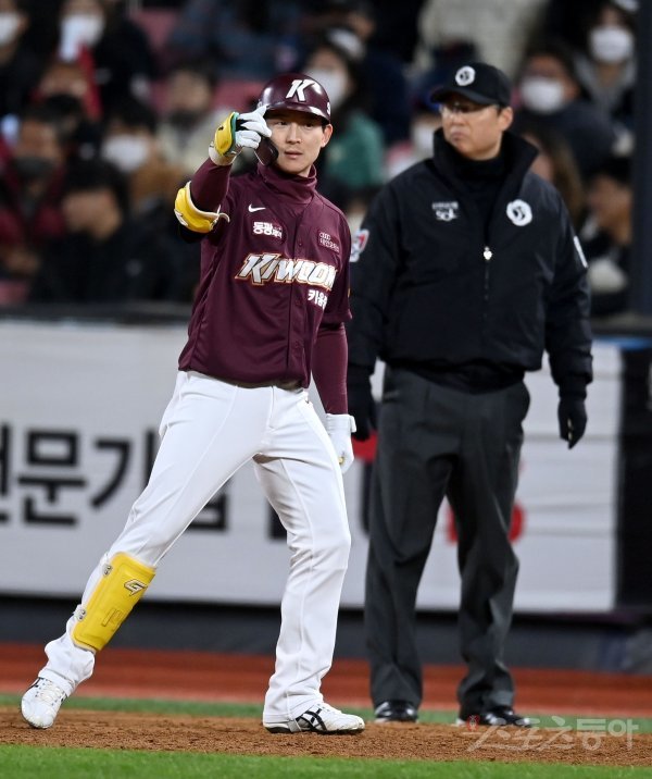 19일 수원KT위즈파크에서 ‘2022 신한은행 MY CAR KBO리그’ 준플레이오프 3차전 키움 히어로즈와 KT 위즈 경기가 열렸다. 4회초 무사 만루 키움 김준완이 2타점 적시타를 치고 있다.