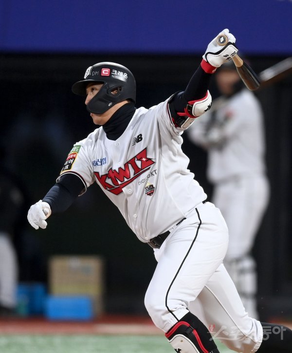 19일 수원KT위즈파크에서 ‘2022 신한은행 MY CAR KBO리그’ 준플레이오프 3차전 키움 히어로즈와 KT 위즈 경기가 열렸다. 2회말 1사 KT 황재균이 좌전 안타를 치고 있다.