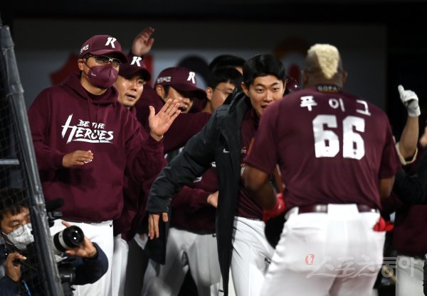 19일 수원KT위즈파크에서 ‘2022 신한은행 MY CAR KBO리그’ 준플레이오프 3차전 키움 히어로즈와 KT 위즈 경기가 열렸다. 1회초 2사 1,2루 키움 푸이그가 좌월 스리런 홈런을 날리고 그라운드를 돌아 홈인해 홍원기 감독과 하이파이브 하고 있다.