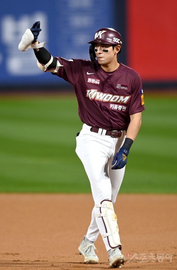 19일 수원KT위즈파크에서 ‘2022 신한은행 MY CAR KBO리그’ 준플레이오프 3차전 키움 히어로즈와 KT 위즈 경기가 열렸다. 1회초 2사 키움 이정후가 우전 안타를 치고 1루에서 기뻐하고 있다.