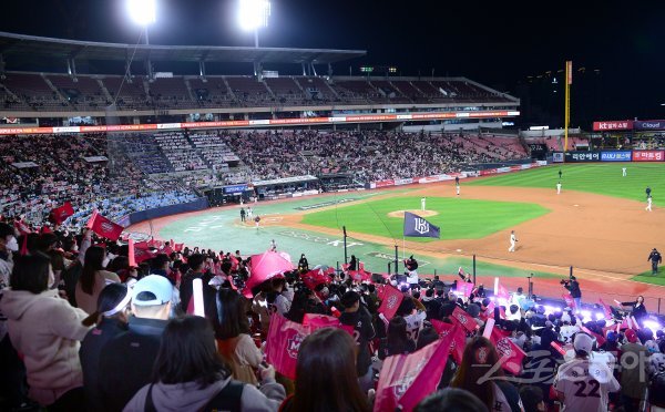 19일 경기도 수원 kt위즈파크에서 ‘2022 신한은행 SOL KBO리그’ kt 위즈와 키움 히어로즈의 준PO 3차전 경기가 열렸다. 내야 2층 관중석이 텅 비어 있다.