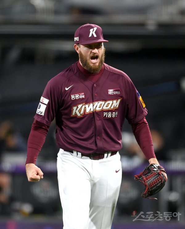 19일 수원KT위즈파크에서 ‘2022 신한은행 MY CAR KBO리그’ 준플레이오프 3차전 키움 히어로즈와 KT 위즈 경기가 열렸다. 선발 투수로 등판한 키움 애플러가 5회말 1사 1,2루 상황에서 병살로 이닝을 막은 후 포효하고 있다.