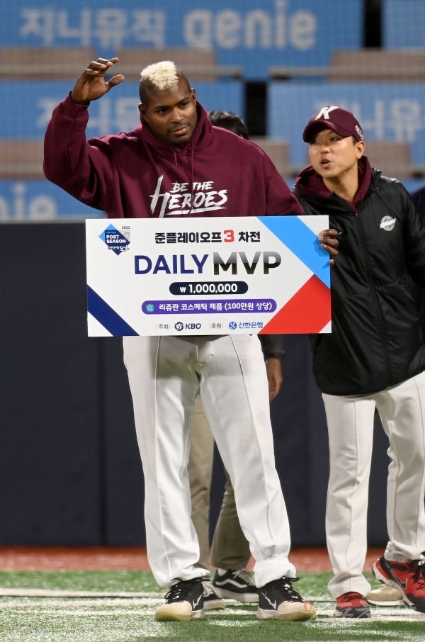 19일 수원KT위즈파크에서 ‘2022 신한은행 MY CAR KBO리그’ 준플레이오프 3차전 키움 히어로즈와 KT 위즈 경기가 열렸다. 준플레이오 3차전 MVP에 선정된 키움 푸이그가 팬들에게 손을 흔들고 있다.