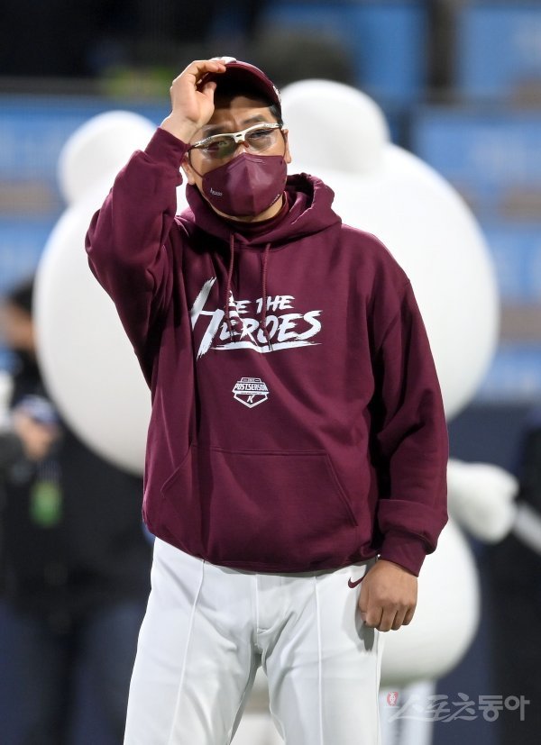 19일 수원KT위즈파크에서 ‘2022 신한은행 MY CAR KBO리그’ 준플레이오프 3차전 키움 히어로즈와 KT 위즈 경기가 열렸다. 9-2 승리를 거두며 준PO 전적 2승 1패를 기록한 키움 홍원기 감독이 팬들에게 인사하고 있다.