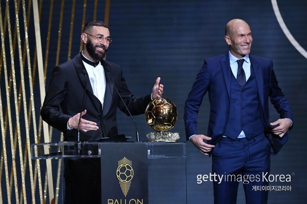 지단은 이번 발롱도르 시상식에서 수상자 벤제마에게 트로피를 직접 건넸다. 사진=게티이미지코리아.