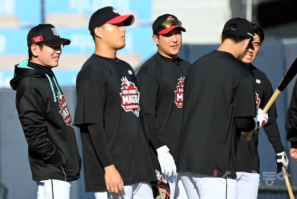 20일 경기도 수원 kt위즈파크에서 ‘2022 신한은행 SOL KBO리그’ kt 위즈와 키움 히어로즈의 준PO 4차전 경기가 열린다. 경기 전 kt 이강철 감독이 훈련을 지켜보고 있다.
