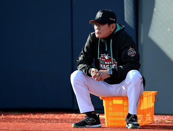 20일 경기도 수원 kt위즈파크에서 ‘2022 신한은행 SOL KBO리그’ kt 위즈와 키움 히어로즈의 준PO 4차전 경기가 열린다. 경기 전 kt 이강철 감독이 훈련을 지켜보고 있다.