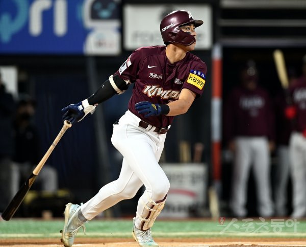 20일 경기도 수원 kt위즈파크에서 ‘2022 신한은행 SOL KBO리그’ kt 위즈와 키움 히어로즈의 준PO 4차전 경기가 열렸다. 1회초 1사 1루에서 키움 이정후가 1타점 2루타를 날리고 있다.